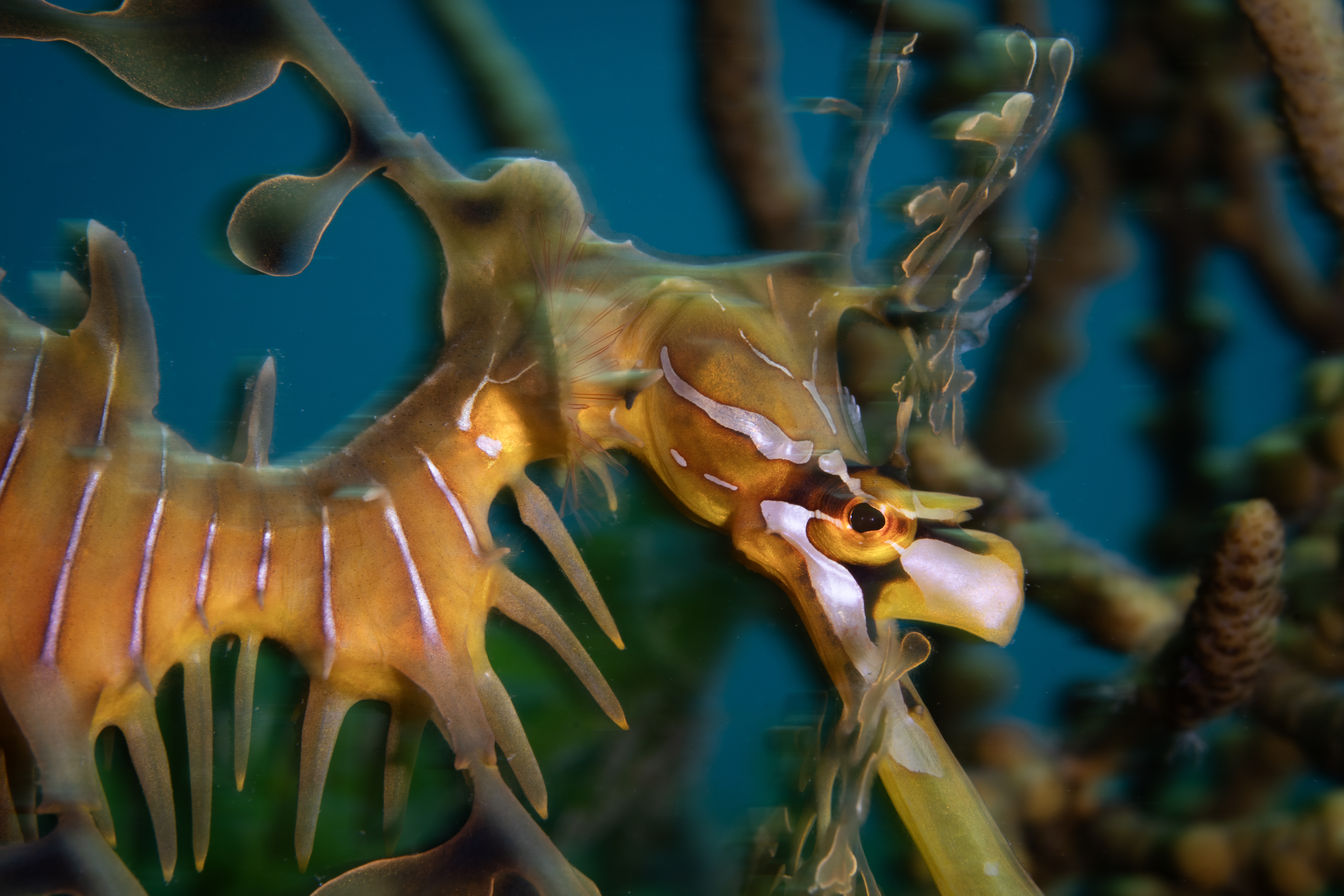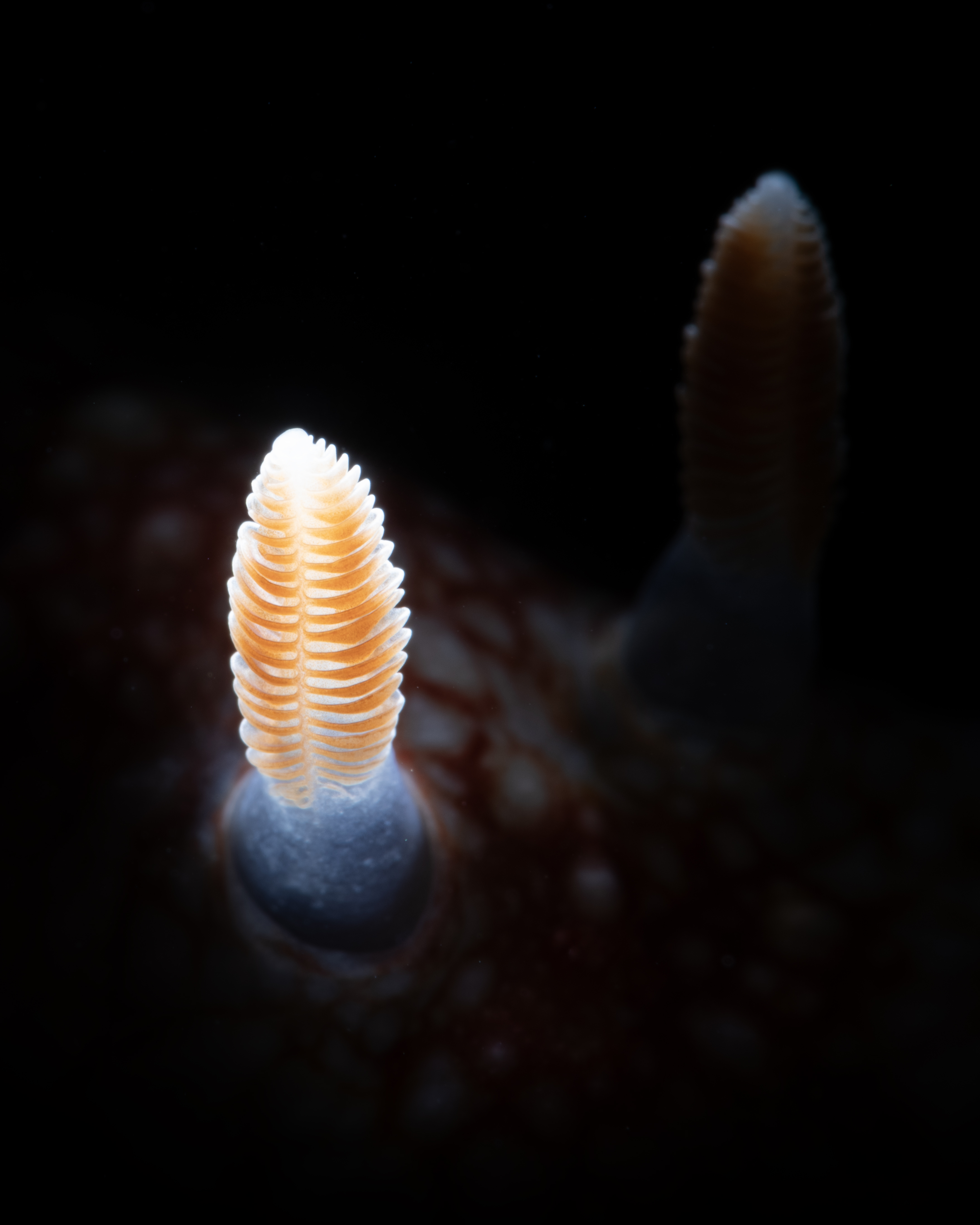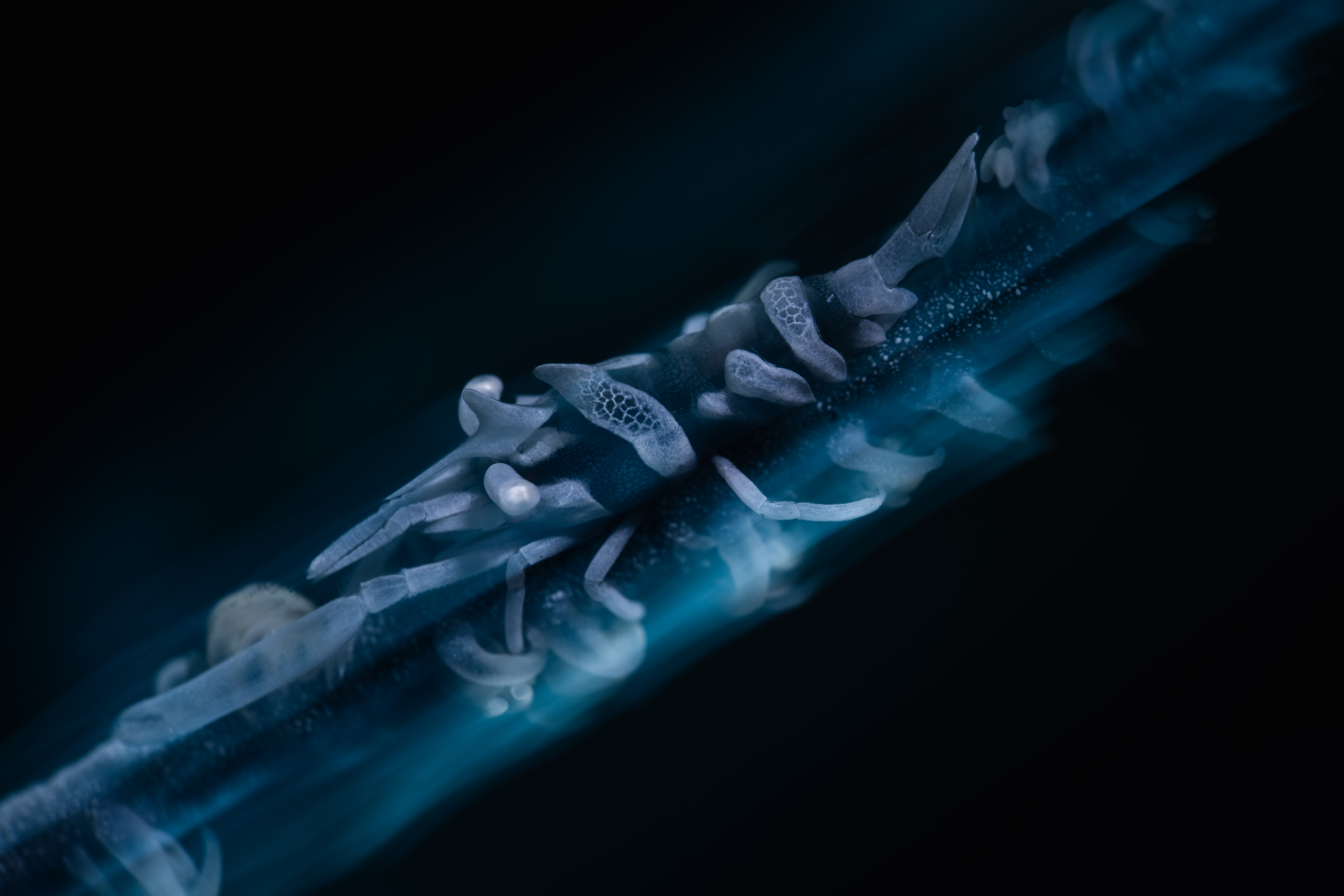 This will depend on the creative effect that you are going for, but most of the time you’ll be limited on the high end to around 1/250-400 depending on your camera’s sync speed with the strobe and around 1/10 on the slow end to avoid unwanted motion blur. An exciting genre of underwater macro to master is the use of intentional blur with slow shutter speeds that can be nicely executed with strobes. The strobes freeze the motion at the moment that the flash fires, burning a crisp part of the shot into the frame, whilst the remainder of the exposure can be left to blur and trail light, creating a dreamy effect.