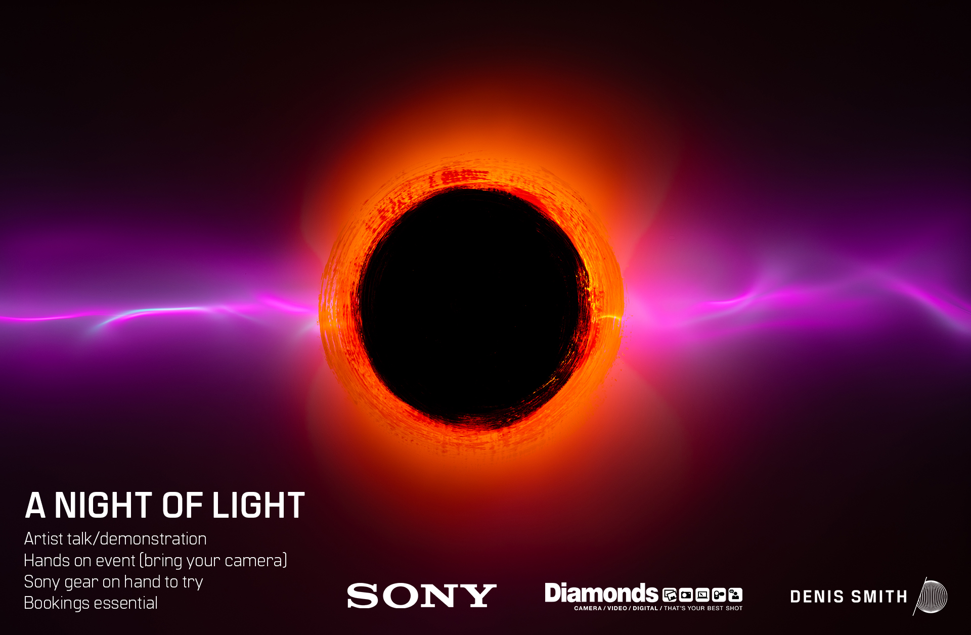 Denis will walk you through the exhibition discussing the techniques used to create these incredible images. Then you will have the opportunity to setup your camera, or try the Sony equipment on hand, and capture images as Denis creates a series of light paintings. This is a hands on event, you will have the chance to pick up a light painting tool and have a go.